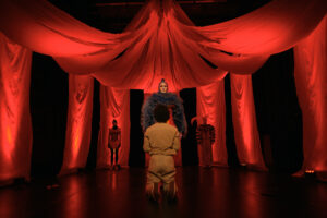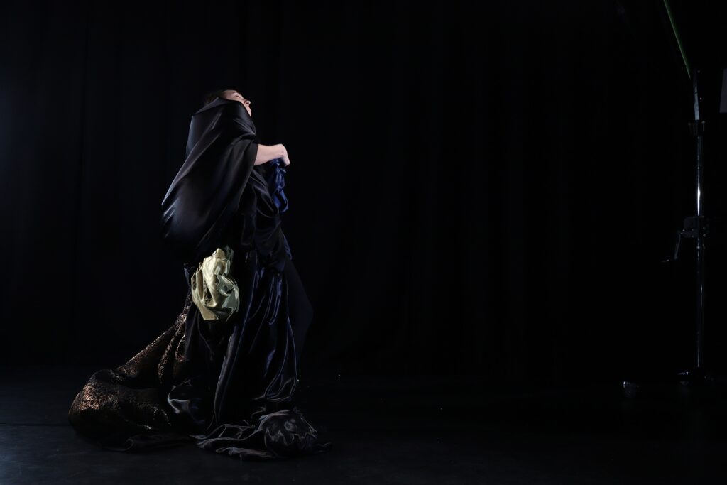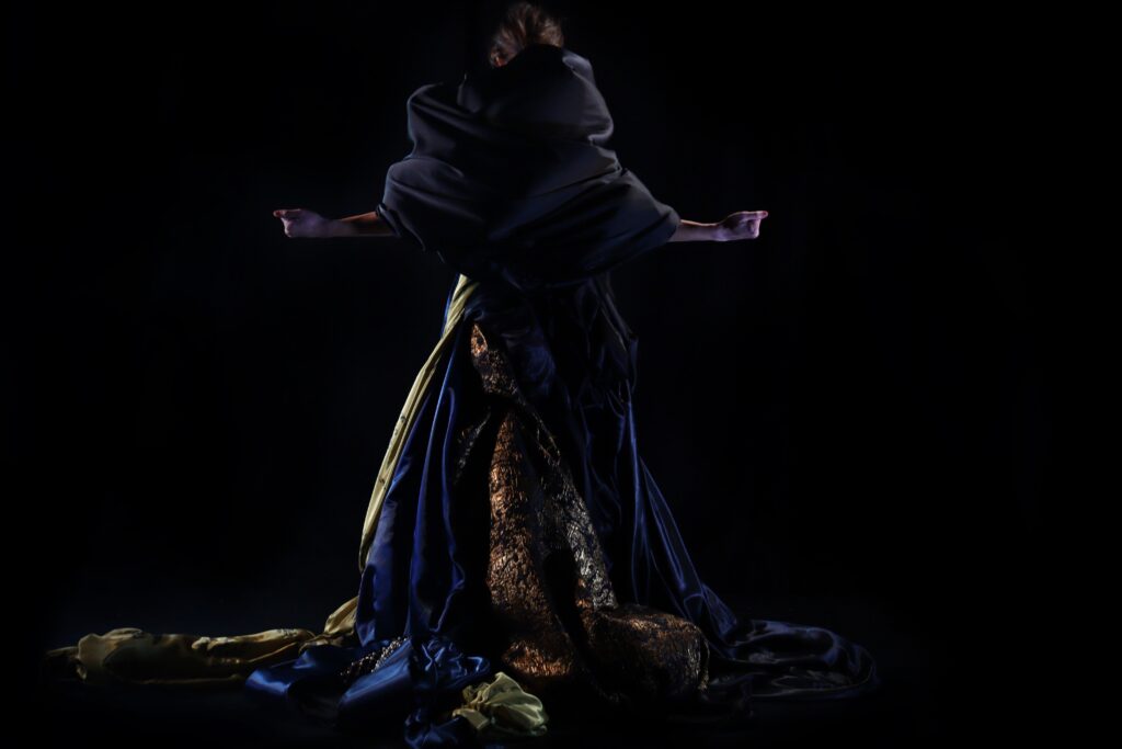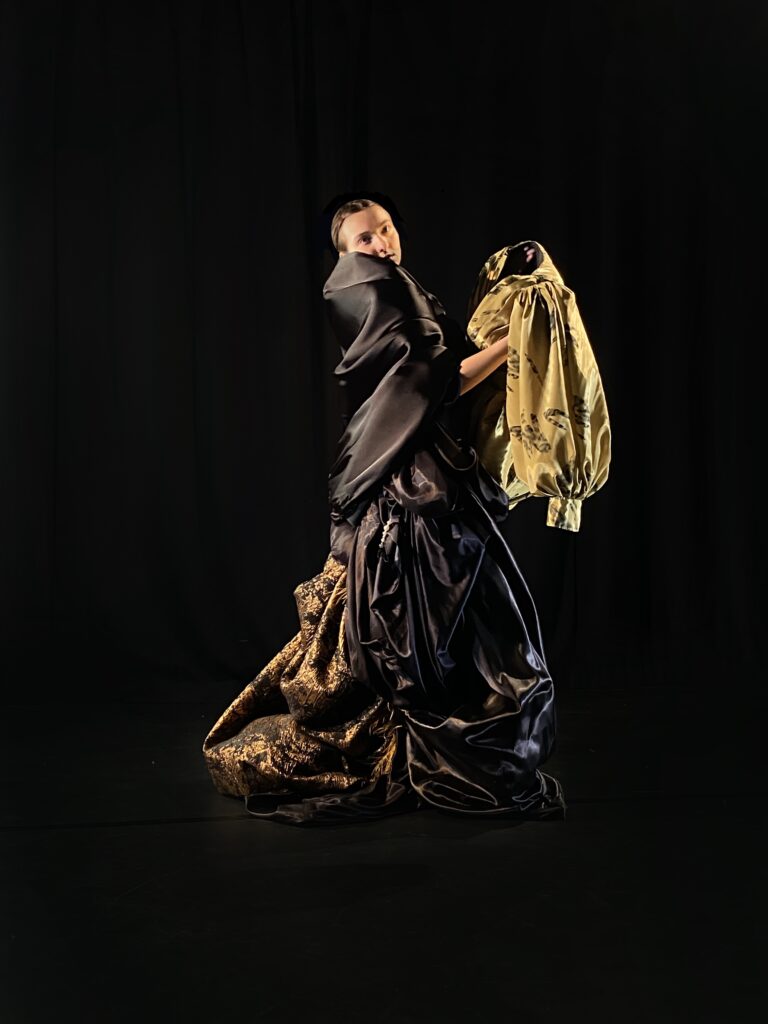 During the performance, he reaches into his cape, from where he removes the dresses he collected from his previous wives. These dresses will weigh Bluebeard down as he holds on to the idea of possession and ownership over them. When finding each dress, he becomes temporarily more confident, as he remembers the happiness he once felt.
